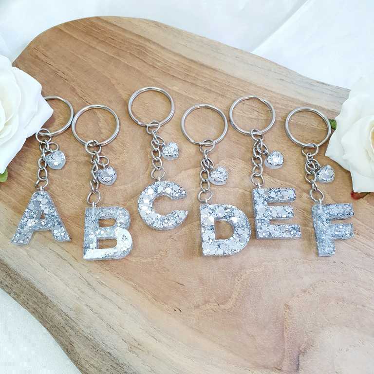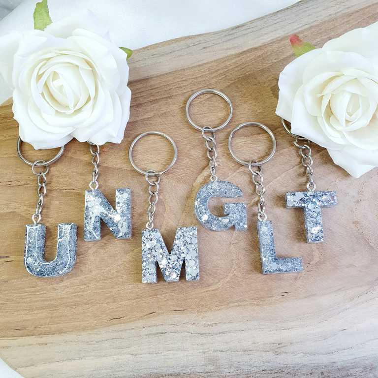 Diese wunderschönen Buchstabenschlüsselanhänger wurden mit einem Siberglitzer gegossen. Sie sind ein absoluter Hingucker an jedem Schlüsselbund und eignen sich super als kleine Geschenkidee.