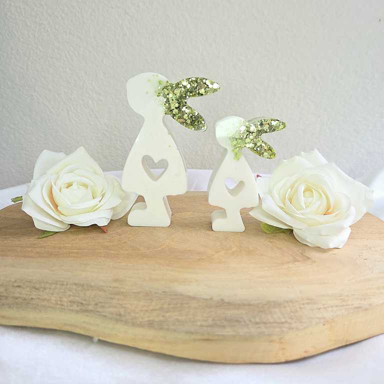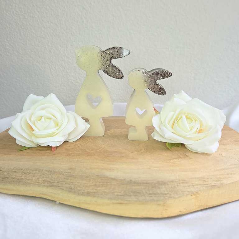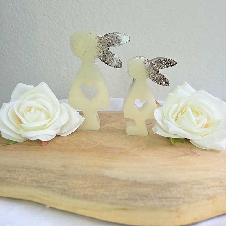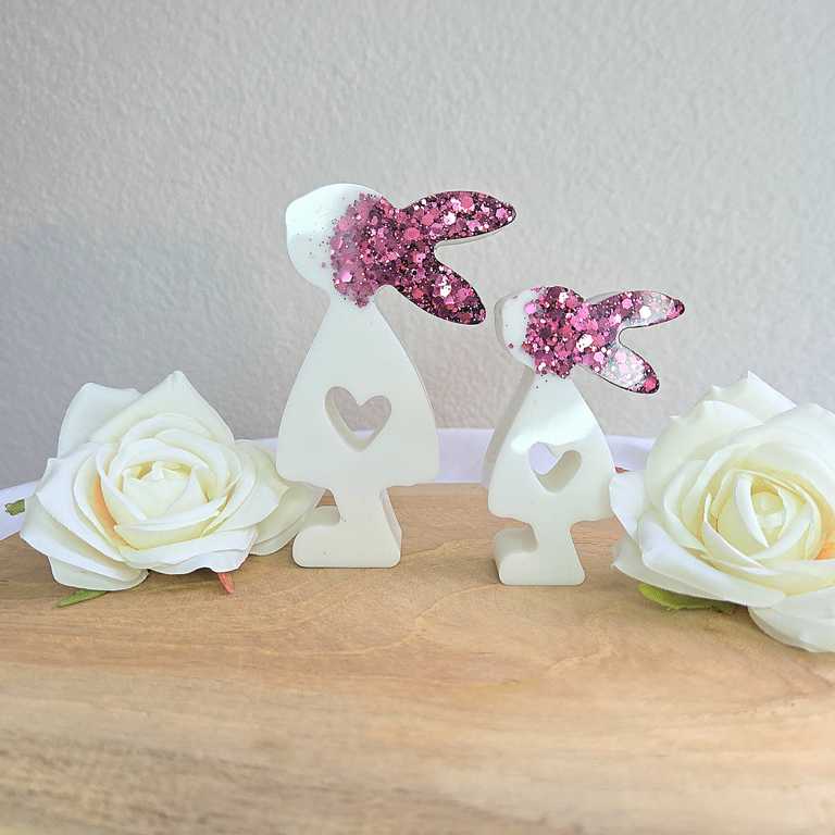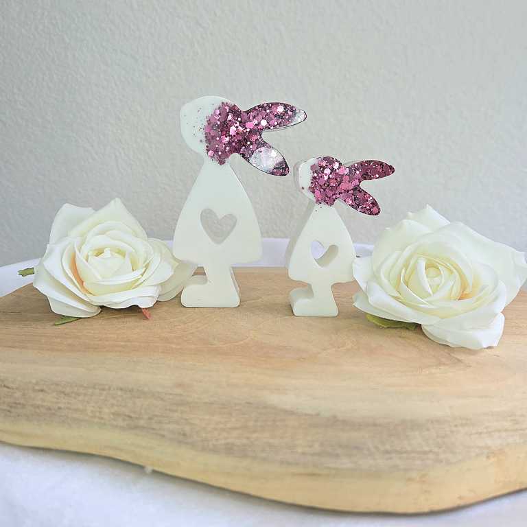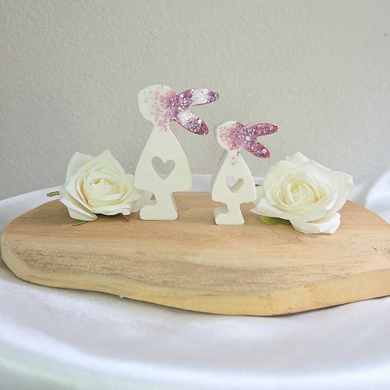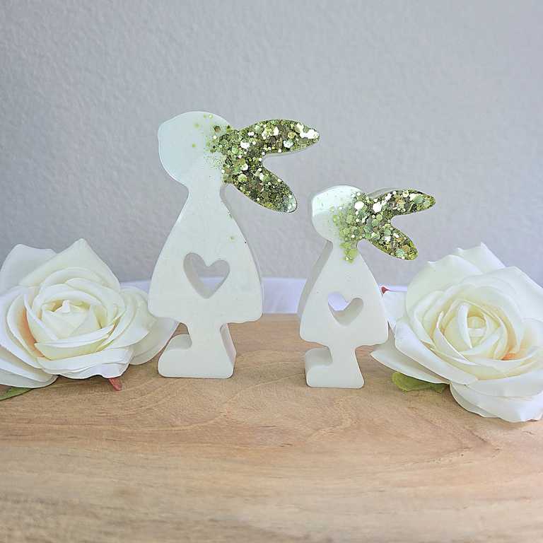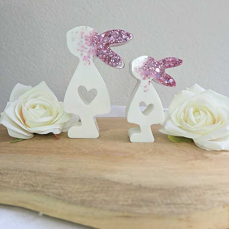 Hier biete ich dir wunderschöne Häschen im 2er Set an, die als Dekoration dienen. Die Ohren wurden mit Glitzer gegossen und funkeln wunderschön im Licht. Sie Häschen sind in verschiedenen Farben erhältlich. Auf Wunsch kann ich dir deine Häschen in deiner Wunschfarbe anfertigen. Melde dich dazu gerne bei mir.