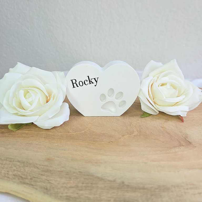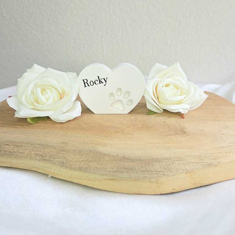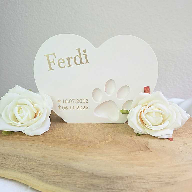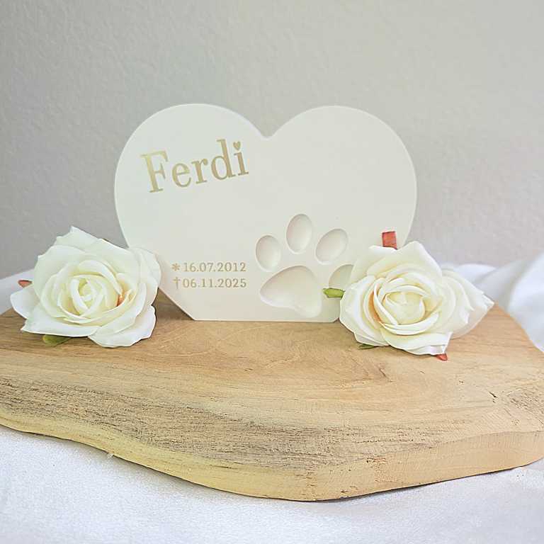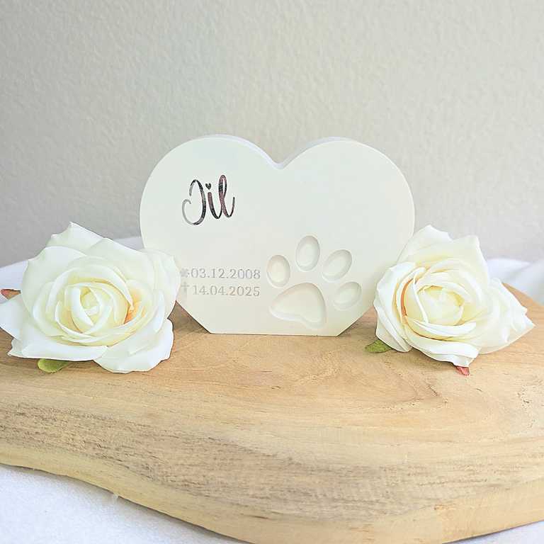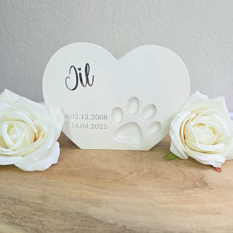 Hier hast du die Möglichkeit, ein Erinnerungsstück in Herzform mit einer Pfote als Andenken an dein geliebtes Tier anfertigen zu lassen.