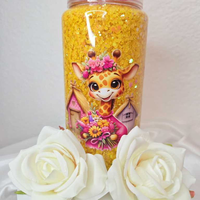 Außen habe ich einen wunderschönen Giraffenaufkleber aufgebracht. Hierbei handelt es sich um ein UV Aufkleber, der sehr langlebig ist und jede Handwäsche stand hält.